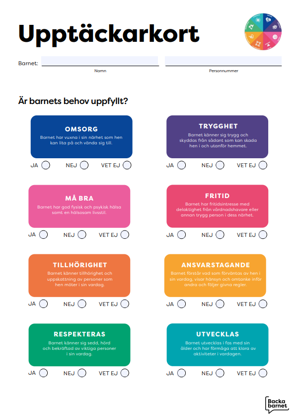 De åtta områdena i Behovskompassen är grunden för och återkommande i samtliga verktyg inom Backa barnet. Verktygen ska hjälpa oss ha barnets bästa i fokus samt ge en ökad förståelse mellan personal, barn och vårdnadshavare, men även mellan personal och personal när barnet behöver stöd från annan eller flera verksamheter.